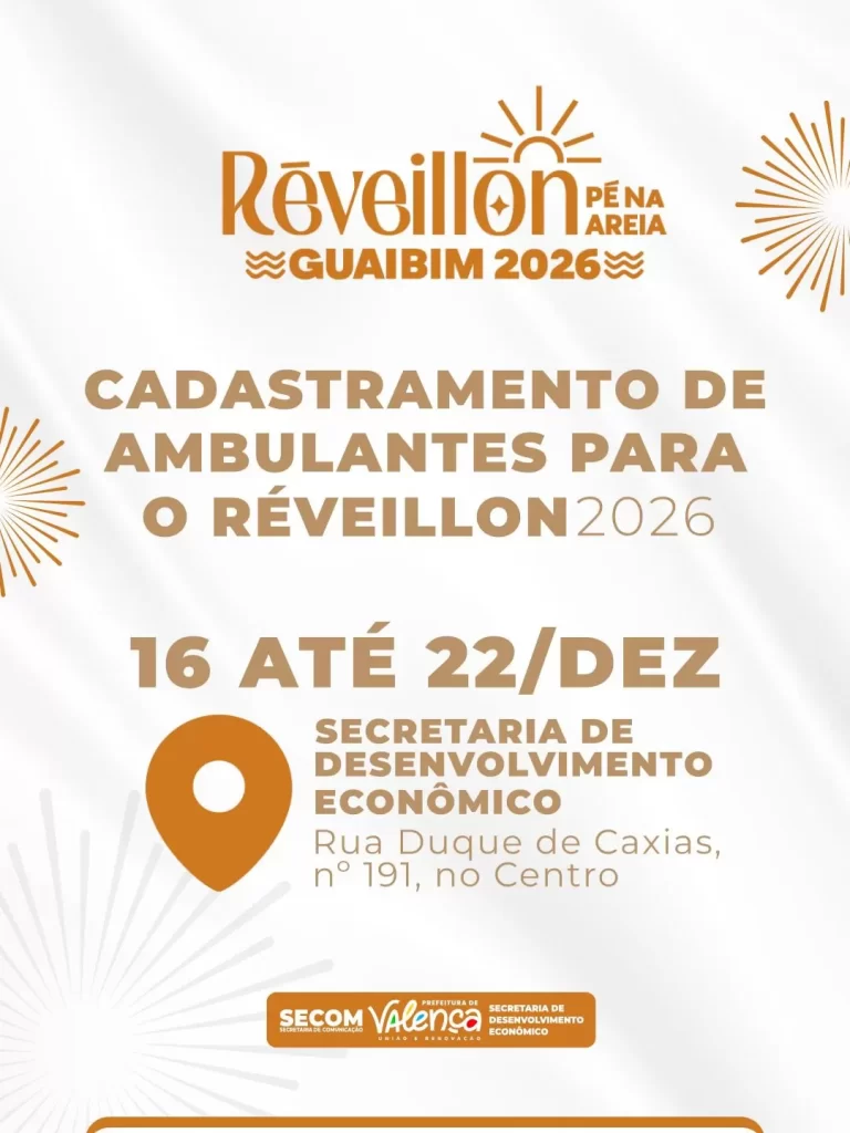 A Prefeitura de Valença, por meio da Secretaria Municipal de Desenvolvimento Econômico, iniciou nesta terça-feira (16) o processo de cadastramento de ambulantes que irão atuar durante o período do Réveillon na praia de Guaibim. A iniciativa tem como objetivo garantir a organização dos espaços públicos, o ordenamento das atividades comerciais e melhores condições de trabalho para os vendedores informais.