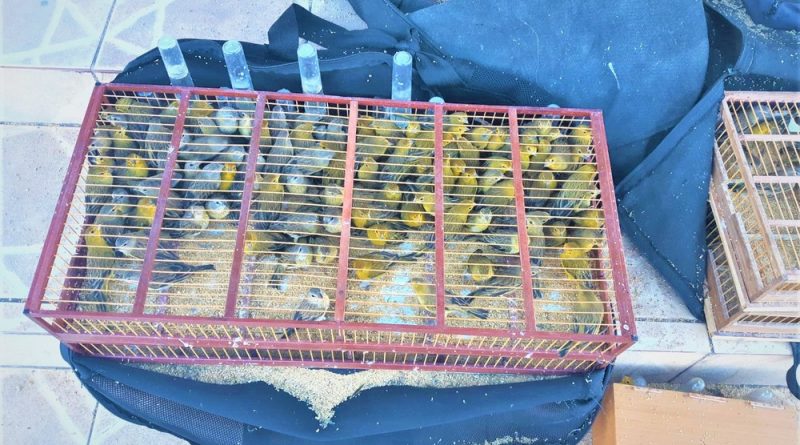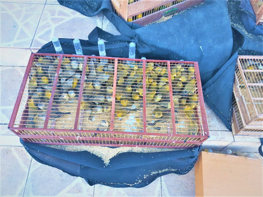 Após procedimento de revista, foram encontrados 798 canários da terra e dois cardeais, todos aprisionados em gaiolas pequenas e em condições precárias de higiene, sem água e ventilação.