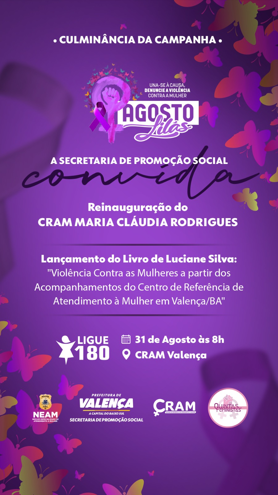 A Prefeitura de Valença, através da Secretaria de Promoção Social, convida todos e todas para a Culminância da Campanha Agosto Lilás, que acontecerá no dia 31/08, às 8 horas da manhã, no Centro de Referência de Atendimento à Mulher.