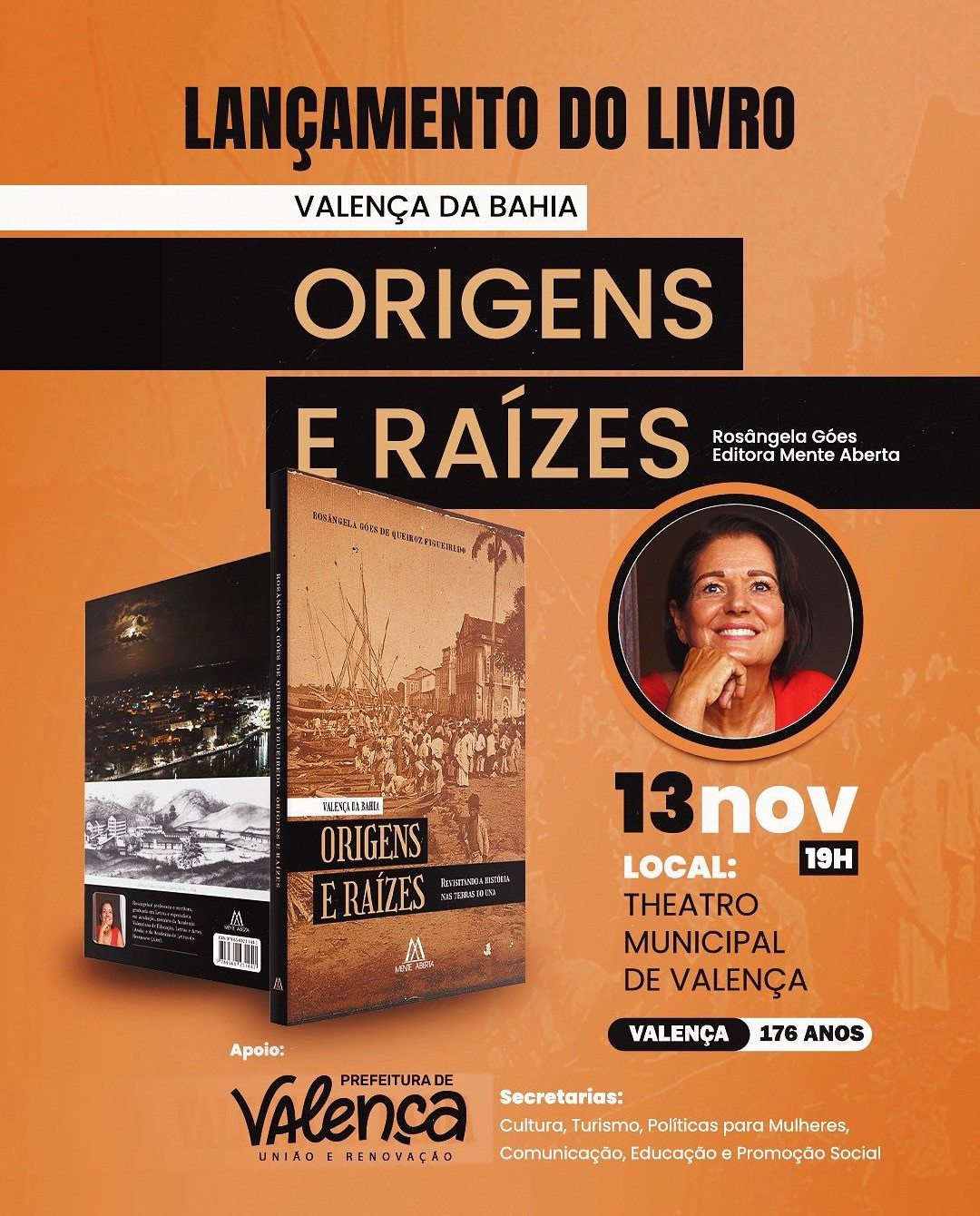 A escritora e professora Rosângela Góes de Queiroz Figueiredo lança, no próximo dia 13 de novembro, às 19h, no Teatro Municipal de Valença, o livro “Valença da Bahia: Origens e Raízes”, publicado pela Editora Mente Aberta. O evento integra a programação oficial do aniversário de 176 anos de Valença e conta com o apoio da Prefeitura Municipal, por meio das Secretarias de Cultura, Educação, Políticas para Mulheres e Reparação, Comunicação e Promoção Social.