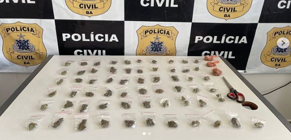 Ainda conforme a PC, foi realizada varredura do terreno sendo encontrado entre fissuras de um muro em construção,1 tesoura, e 64 poções de maconha. Todo o material foi apresentado na delegacia, ficando a disposição da autoridade policial.