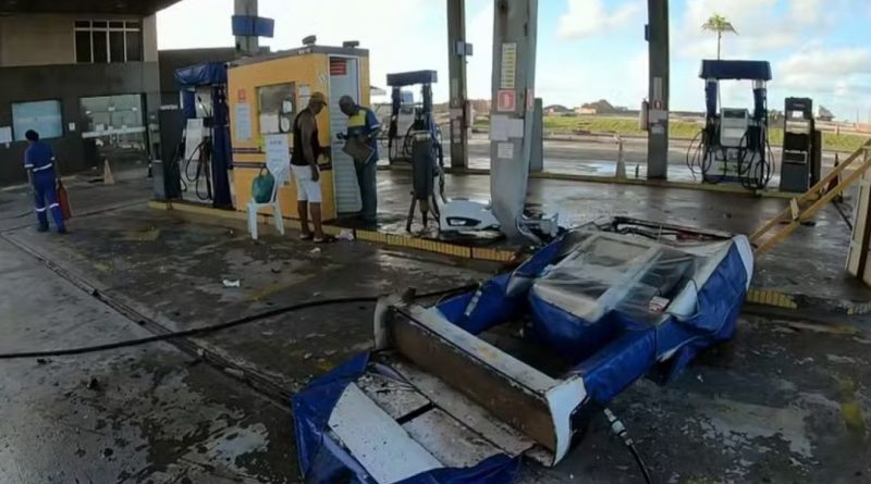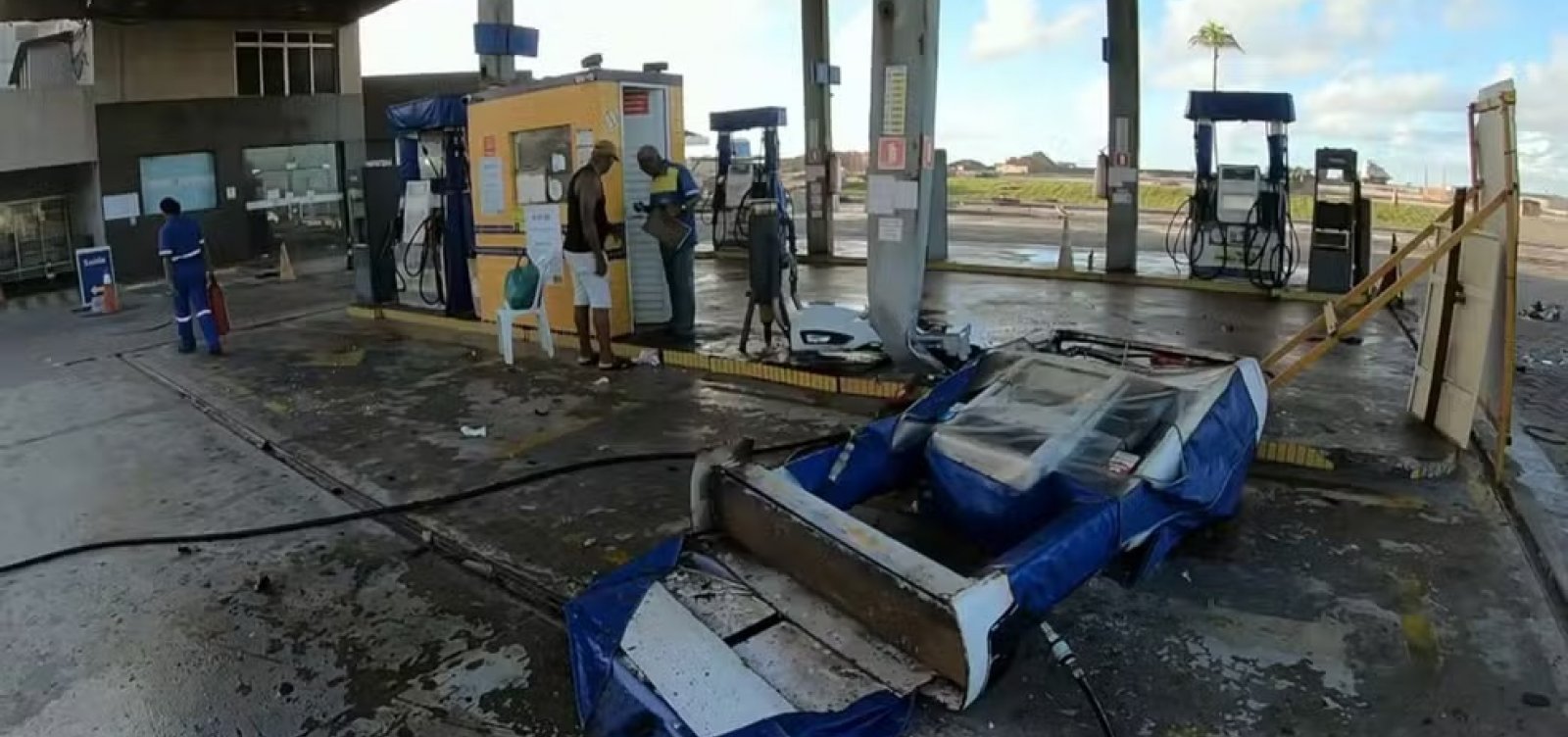 Diante do impacto, o equipamento foi retirado do chão e a coluna que sustenta a estrutura do posto ao mesmo tempo foi danificada. E para a segurança de todos foi desligada a energia elétrica do posto combustíveis