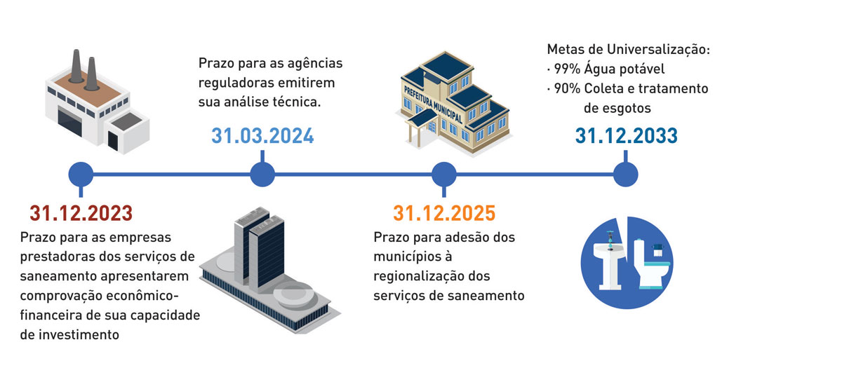 Os novos prefeitos têm o desafio de atender uma antiga demanda da população: aumentar os indicadores de saneamento dos municípios como forma de atender as metas estabelecidas pelo Novo Marco Legal do Saneamento, aprovado em julho de 2020. Até 2033, as cidades devem alcançar 99% de acesso à água potável e 90% de coleta e tratamento de esgoto.