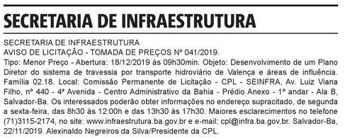 O aviso de licitação para a contratação de empresa especializada para desenvolvimento de um Plano Diretor do sistema de travessia foi publicado no Diário Oficial do Estado (D.O.E.) do último sábado (23). A abertura dos envelopes com as propostas está prevista para 18 de dezembro.