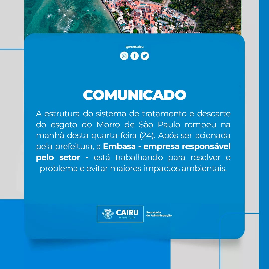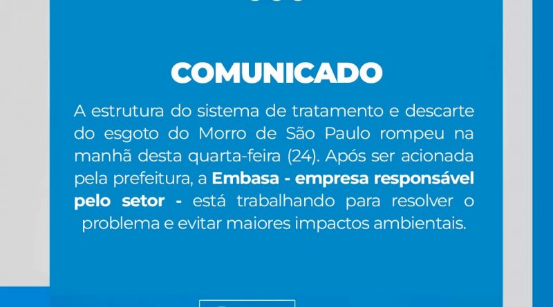 A estrutura do sistema de tratamento e descarte do esgoto do Morro de São Paulo rompeu na manhã desta quarta-feira (24). A Embasa, empresa responsável pelo setor, está trabalhando para resolver o problema e evitar maiores impactos ambientais negativos.