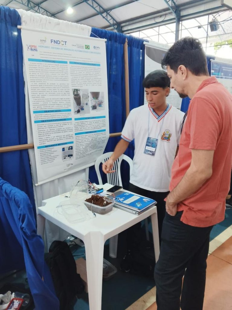 No Território de Identidade do Litoral Sul (NTE 5), o Centro Estadual de Educação Profissional da Floresta do Cacau e do Chocolate Milton Santos, localizado em Arataca, foi destaque na categoria Projeto de Ciências com o “Hidrobot – irrigador automatizado com arduino” dos estudantes Smenio da Silva Santos e Wendel de Souza Rodrigues. O trabalho promove práticas sustentáveis e eficientes de irrigação, ajudando a conservar recursos hídricos e a melhorar a produtividade agrícola. Segundo o professor-orientador Dely da Silva Lima Neto, a ideia para a criação do Hidrobot surgiu a partir da necessidade de unir tecnologia ao contexto onde a unidade escolar está inserida. “A proposta foi integrar a tecnologia com o ambiente agrícola, já que a escola está localizada em um assentamento rural. Ver o projeto dos meus alunos alcançar uma posição de destaque em um evento de nível nacional é gratificante. Isso representa o reconhecimento do esforço, da dedicação e da criatividade que eles investiram no projeto. Além disso, é um reflexo da importância de unir a tecnologia com o contexto em que vivemos”.