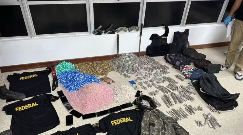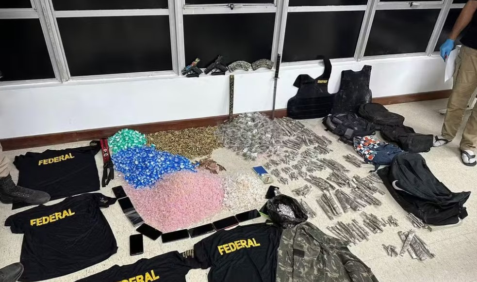 Segundo a Polícia Militar, os presos foram encontrados em um imóvel abandonado na localidade conhecida como “Guiné”. Durante a ação, foram apreendidos duas pistolas, uma .40 e uma 9mm, dois carregadores 556, duas mil munições de calibres diversos, uma espada katana, quatro camisas com a inscrição “federal”, uma blusa camuflada, vastas quantidades de pinos de cocaína, pedras de crack e porções de maconha, além de 11 celulares e uma placa para colete balístico.