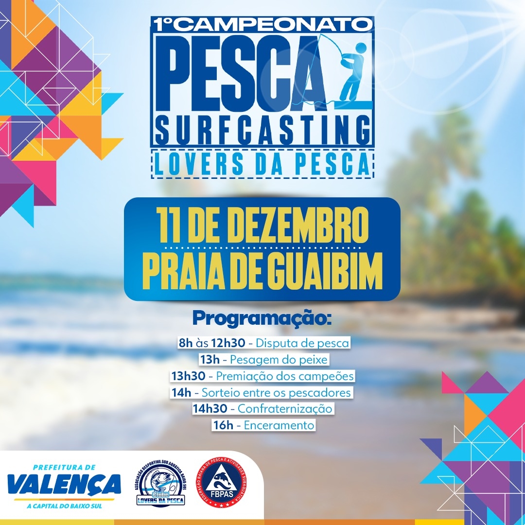 A Prefeitura de Valença em parceria com a Associação Desportiva Subaquática Baixo Sul e com a Federação Baiana de Pesca e Atividades Subaquática(FBPAS), realizam o 1° Campeonato Pesca Surfcasting-Lovers da Pesca.