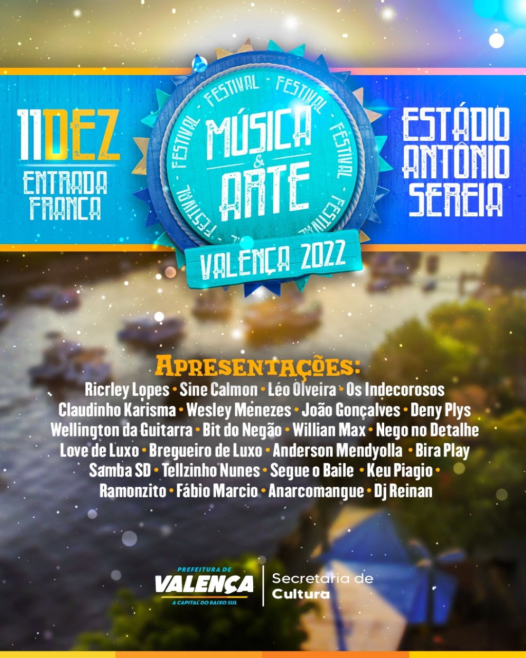 A Prefeitura de Valença, através da Secretaria de Cultura em parceria com o Sindicato dos Músicos, realizará neste domingo(11) o 1° Festival Música e Arte Valença 2022.