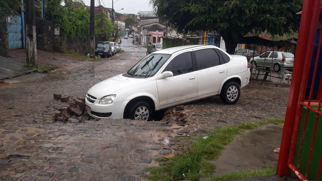 Um veículo Chevrolet Classic, branco, caiu em um buraco na manhã desta quinta-feira (12), no bairro de Tamarineiro, em Valença. Não há informações se havia alguma deformação no calçamento anteriormente e se agravou com a chuva.