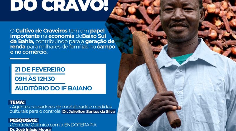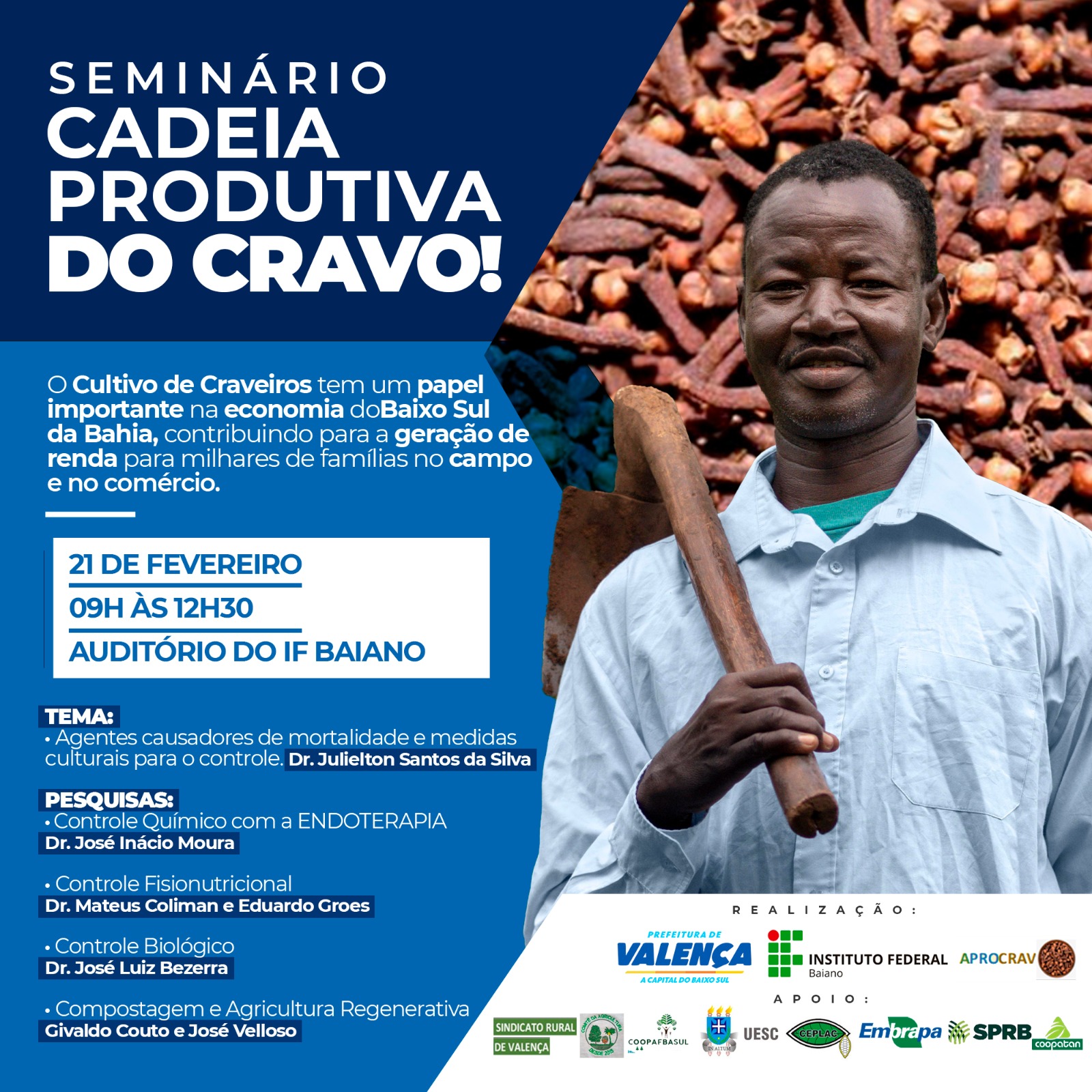 Como incentivo ao cultivo de craveiros, uma das culturas mais promissoras do baixo sul, a Prefeitura de Valença estará promovendo, no dia 21 de fevereiro, no auditório do IF BAIANO, o ‘Seminário da cadeia produtiva do cravo – Salve o cravo’.