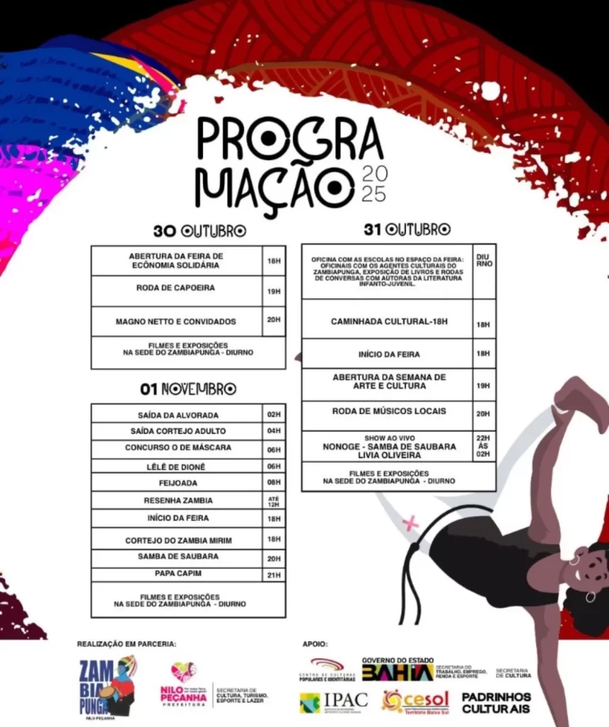A programação contará com apresentações artísticas, oficinas, cortejos e diversas atividades culturais, proporcionando momentos de aprendizado, integração e valorização da cultura local. O Zambiapunga, símbolo de resistência e orgulho do município, será mais uma vez o grande protagonista dessa festa que já faz parte do calendário cultural da região.