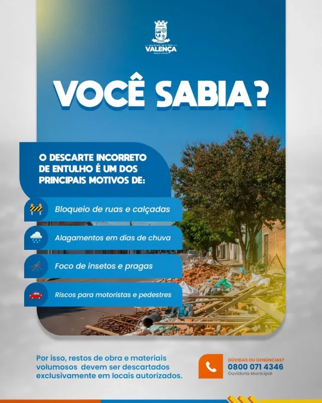 Câmara Municipal de Valença realizou, na manhã desta segunda-feira (27), uma ação de comunicação voltada à orientação e conscientização da população sobre o descarte inadequado de entulho no município. A iniciativa destaca os prejuízos causados pela prática irregular e reforça a necessidade de utilização exclusiva dos pontos autorizados para o descarte de resíduos provenientes de obras e materiais volumosos.