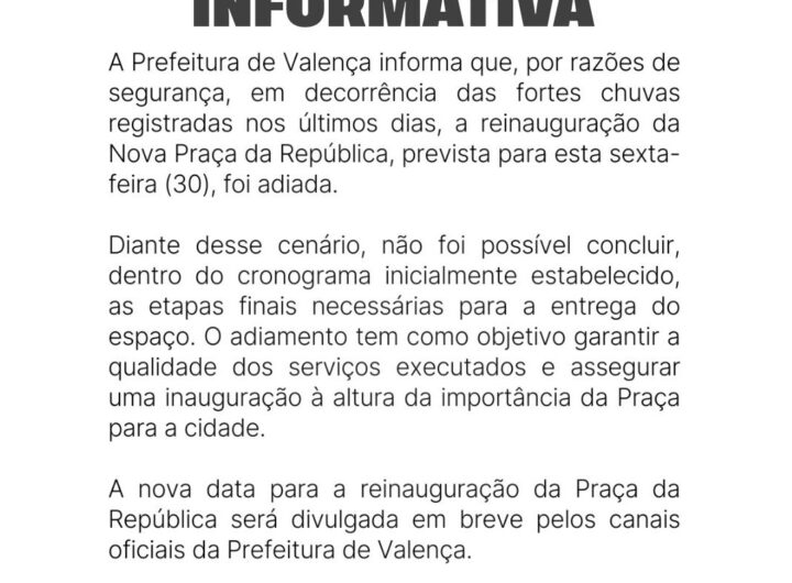 A Prefeitura de Valença informa que, por razões de segurança, em decorrência das fortes chuvas registradas nos...