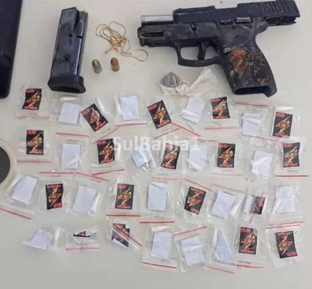Foram apreendidos – uma arma de fogo, porções de entorpecentes e materiais que, conforme a PM, seriam utilizados para o armazenamento e a comercialização de drogas.