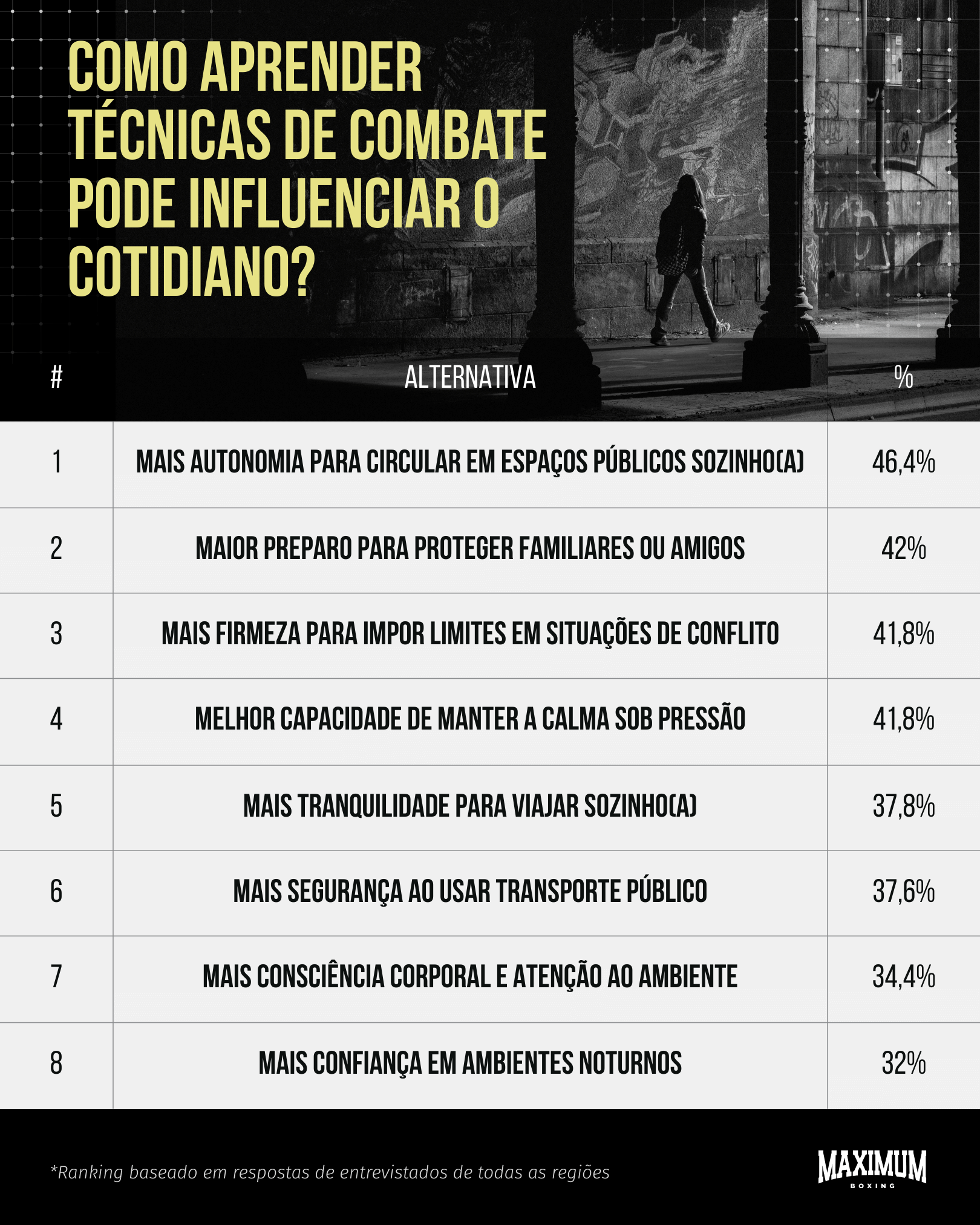 Para os respondentes, dominar essas técnicas pode tornar experiências antes marcadas pela desconfiança mais seguras, como viajar sozinho (37,8%), utilizar o transporte público (37,6%) e frequentar ambientes noturnos (32%).