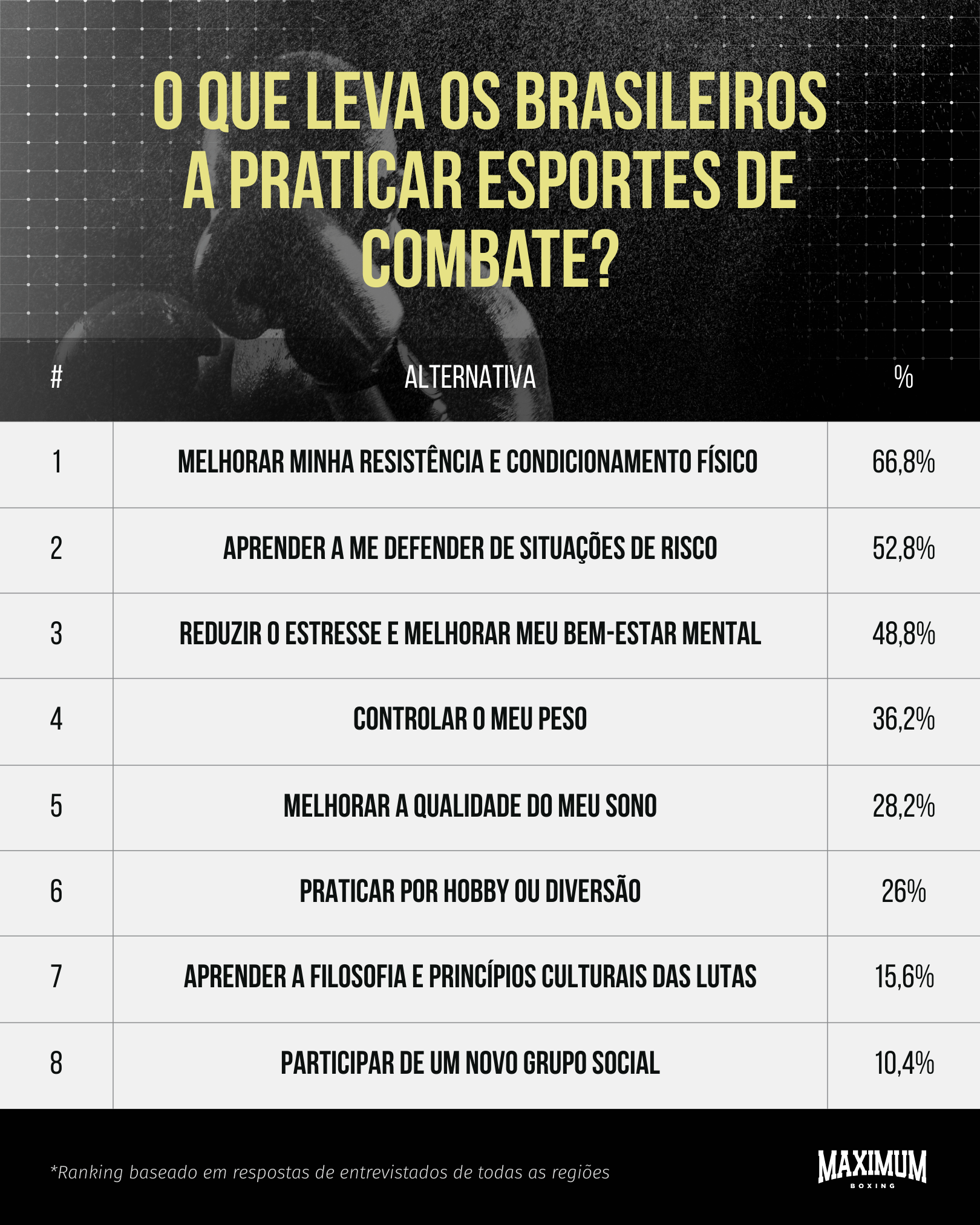 Ao todo, os respondentes tiveram acesso a 8 questões, que exploraram a motivação e o impacto dos esportes de combate sobre os brasileiros. A organização das respostas possibilitou a criação de diferentes rankings, nos quais você confere o percentual de cada alternativa apontada pelos entrevistados.