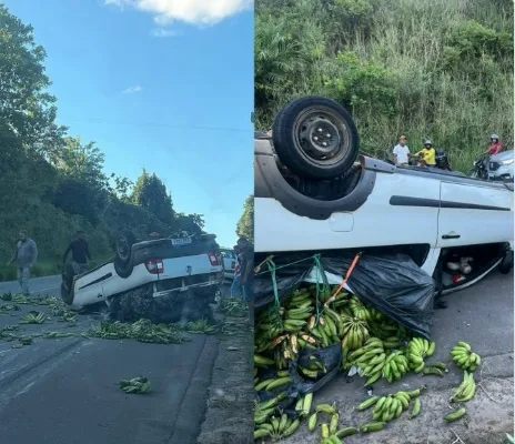 Com o impacto, toda a carga de bananas que transportava, foi espalhada pela pista e não pôde ser aproveitada.