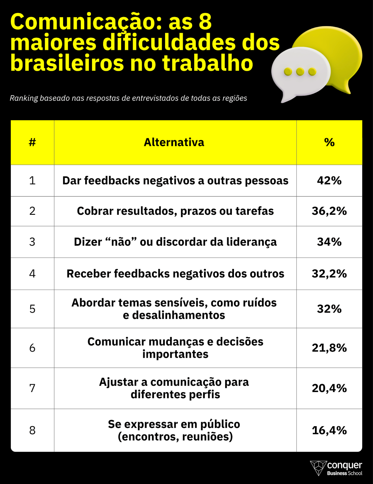 (crédito: iStock) Embora, hoje, 7 em cada 10 brasileiros se considerem bons comunicadores no trabalho — se expressando com clareza e segurança na maioria das vezes —, existe uma situação onde muitos ainda enfrentam uma dor comum: na hora de dar feedbacks negativos a outros colaboradores, o maior desafio de comunicação apontado pelos entrevistados em um estudo recente sobre o tema. Os dados acabam de ser divulgados pela Conquer, escola de negócios que oferece cursos de liderança e desenvolvimento profissional e, nas últimas semanas, pediu que líderes e liderados analisassem o papel dessa competência no ambiente corporativo, entre ações como falar em público, ter conversas difíceis e compartilhar decisões importantes. Mesmo com certa dificuldade na hora dos feedbacks, algo que também aparece nos momentos onde precisam cobrar prazos ou dizer não à própria liderança (35%), segundo os respondentes, a autoavaliação final seria positiva… e bastante influenciada pelos tantos aprendizados vindos de bons ex-líderes, como ouvir ativamente (56,2%) e demonstrar empatia durante as trocas (51,6). Leia mais: Como os brasileiros avaliam a própria comunicação no trabalho? Independentemente da área, a comunicação é, hoje, uma das competências mais importantes no meio corporativo — algo que os entrevistados pela Conquer não apenas reconhecem, mas vêm buscando aprimorar. Quando questionadas sobre o assunto, a maioria das pessoas ouvidas não deixaram dúvidas: sentem que, no geral, se comunicam assertivamente dentro das empresas (72,6%), ao passo que apenas 27,2% reconhecem certa dificuldade ao se expressarem no dia a dia. Mesmo com uma autoavaliação geral positiva, contudo, os considerados no estudo não ignoram as diversas situações onde, hoje, se comunicar traz consigo uma série de incômodos ou receios, que seguem desafiando os respondentes. É o caso, por exemplo, dos temidos feedbacks negativos: enquanto, de um lado, 32,2% dos entrevistados reconheceram a dificuldade de recebê-los, para 42% deles, o problema maior é ter de criticar, avaliar ou apontar melhorias sobre o trabalho de terceiros — assim como as situações onde precisam cobrar resultados, prazos ou tarefas (36,2%) e dizer “não” ou discordar da liderança (34%). |