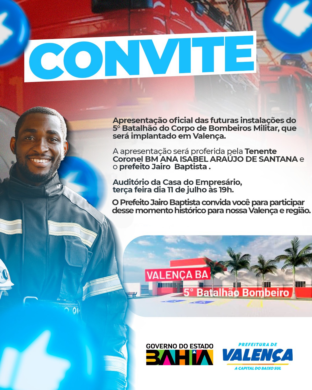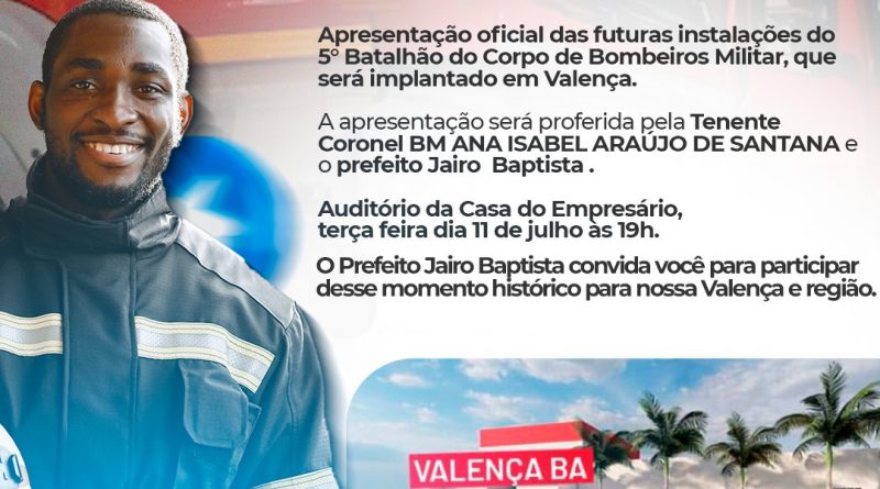 Nesta terça-feira, dia 11 de julho, às 19 h, no auditório da casa do empresário será realizada a apresentação oficial das futuras instalações do 5º batalhão do Corpo de Bombeiros Militar, que será implantado em Valença.