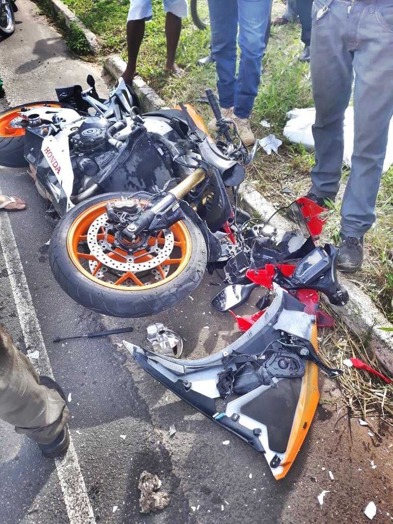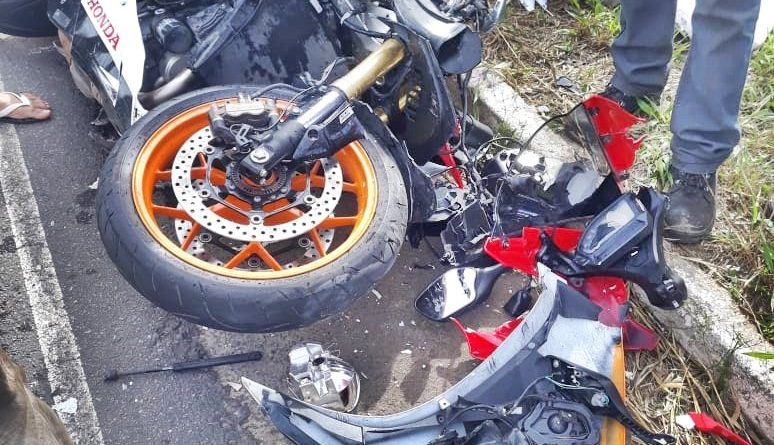 Segundo informações uma moto Honda CBR 1000 de placa QKU-5B39 teria colidido frontalmente com um ônibus que estava realizando uma manobra na contramão para estacionar.