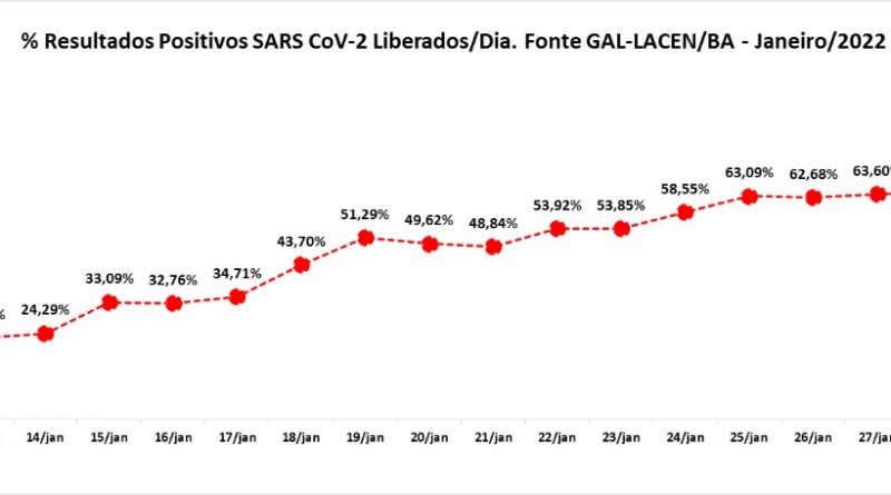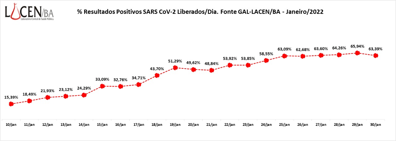 Entre 1º e 30 de janeiro, o Laboratório Central de Saúde Pública da Bahia (Lacen-BA) realizou 102.359 exames do tipo RT-PCR para Covid-19. A cada 100 amostras analisadas, 6,55 eram positivas no início do mês. Agora são 63,39, um aumento de 867% na taxa de positividade para a doença.