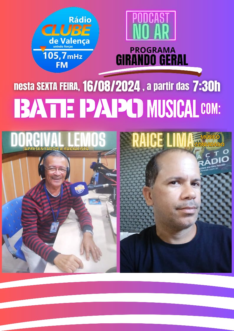 Nesta sexta-feira(16), a partir das 7:30 min, o músico eclético Raice Lima, participará do programa Girando Geral, como Dorgival Lemos, na Rádio Clube de Valença.