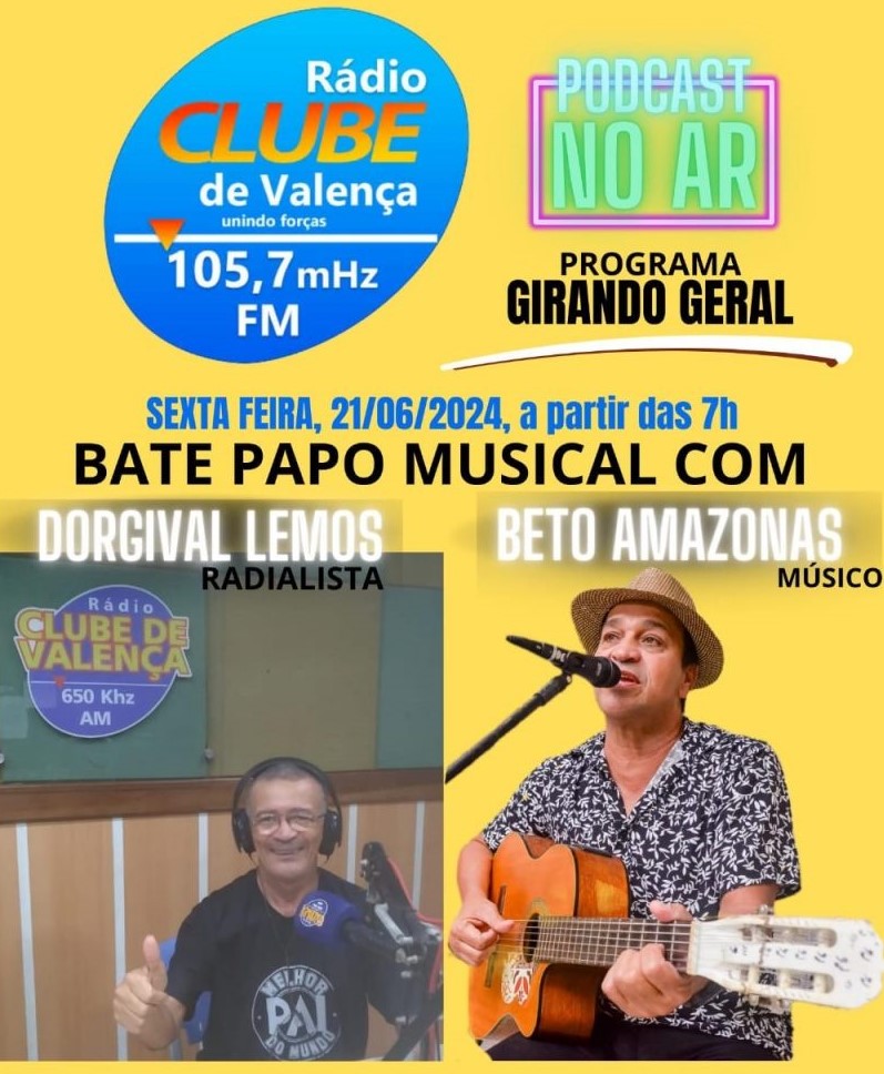 Nesta sexta-feira (21), a partir das 7:00h, o cantor Beto Amazonas participará do programa Girando Geral, com Dorgival Lemos, na Rádio Clube de Valença. O programa tem um novo quadro, o Bate Papo Musical em que convida toda semana uma nova atração. Mais uma vez terá como convidado o eclético cantor