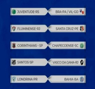 A Confederação Brasileira de Futebol (CBF) definiu os confrontos da quarta fase da Copa do Brasil. O sorteio foi realizado no final da manhã desta sexta-feira (12). O destaque vai para o duelo entre Santos e Vasco. Corinthians encara a Chapecoense, Fluminense mede forças com Santa Cruz, Londrina pega o Bahia e o Juventude enfrenta o vencedor entre Bragantino do Pará e Vila Nova-GO.