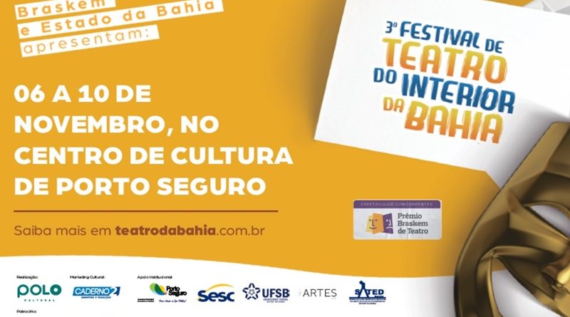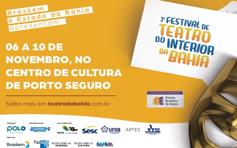 A 3ª edição do Festival de Teatro do Interior da Bahia será realizada na cidade de Porto Seguro, no mês de novembro. O festival ocorrerá entre os dias 6 a 10 de novembro e contará com mesas redondas, palestras, além da exibição de 12 espetáculos teatrais.