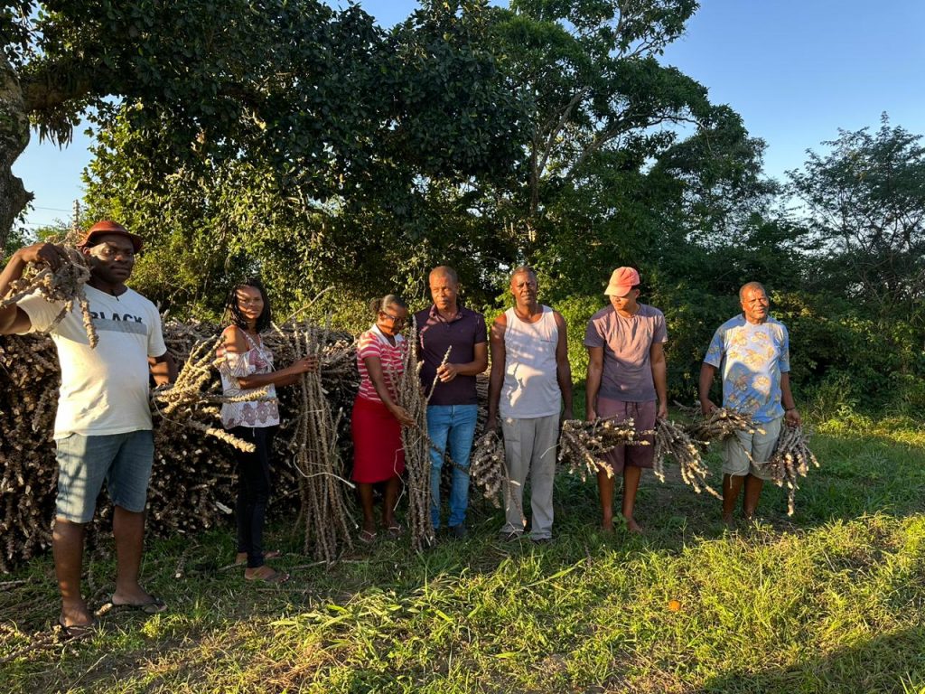 Famílias de comunidade rural de Conceição da Feira celebram avanços na mandiocultura. As famílias agricultoras filiadas à Associação Comunitária Rural Pedro Amorim (ACRPA), da Comunidade Murici, no município de Conceição da Feira, celebram mais uma etapa de execução dos investimentos do Governo do Estado na comunidade. Dessa vez, as famílias receberam 60 metros cúbicos de manivas sementes clonais (mudas) de mandioca de alto valor genético e fitossanitário e de alta precocidade e produtividade para a implementação de maniveiros na comunidade.