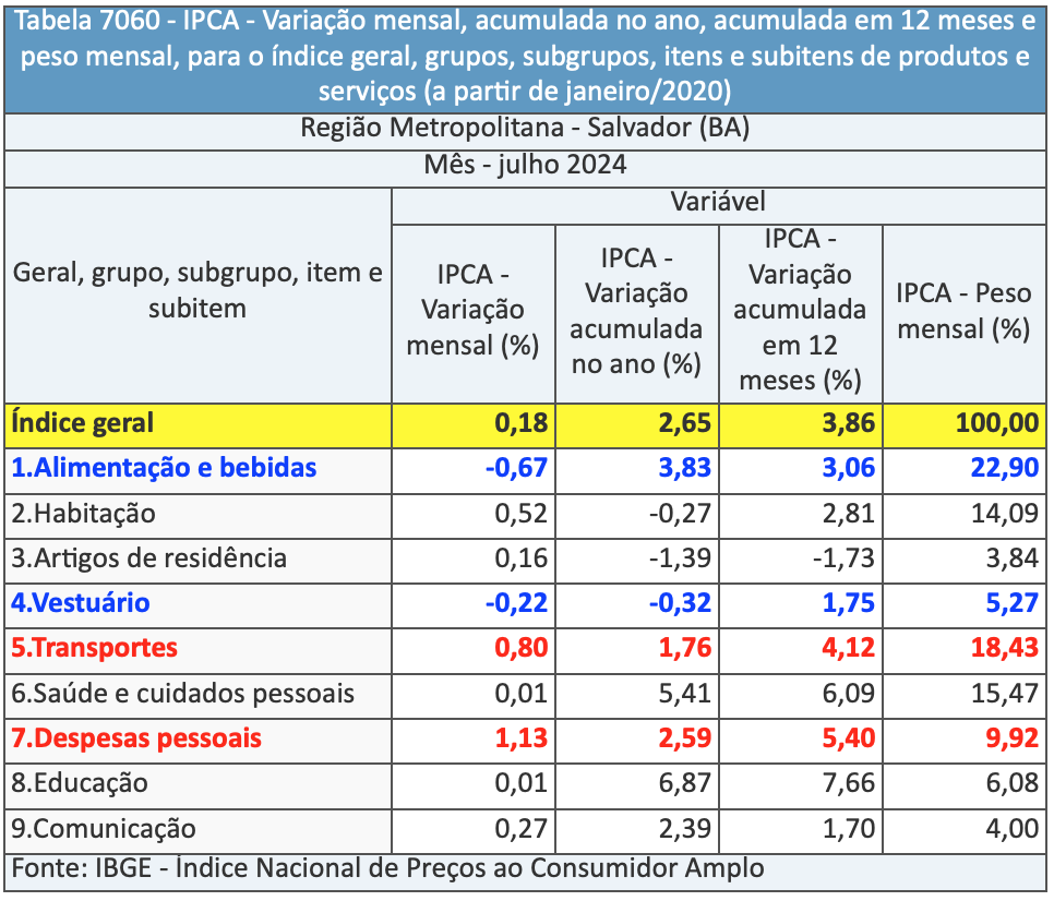 ** O IPCA de julho na RM Salvador (0,18%) acelerou em relação a junho (quando havia sido -0,04%), mas foi o menor dentre os 16 locais pesquisados (empatado com o de Aracaju/SE) e ficou abaixo do nacional (0,38%);