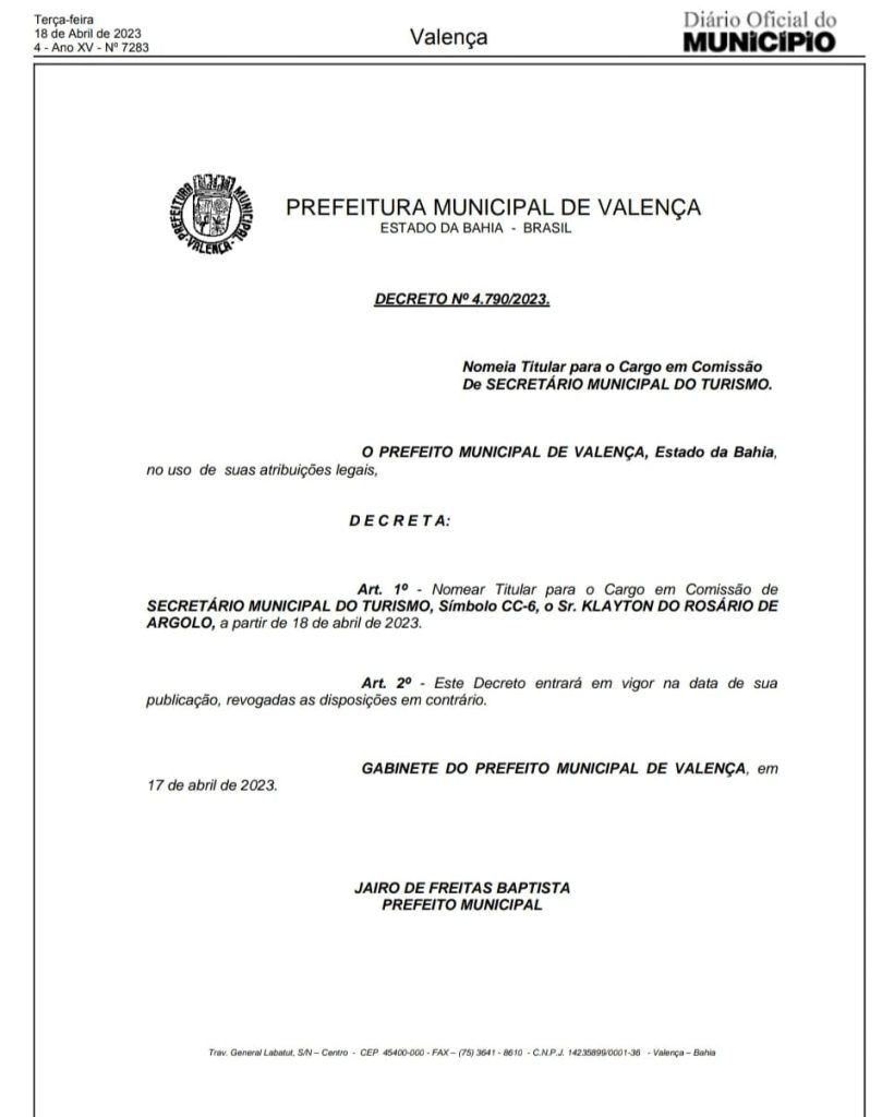 O administrador Klayton do Rosário Argôlo foi nomeado como Secretário Municipal de Turismo de Valença. O Decreto n° 4.790/2023, assinado pelo prefeito Jairo Baptista, foi publicado no Diário Oficial do município nesta terça-feira, 18 de abril.
