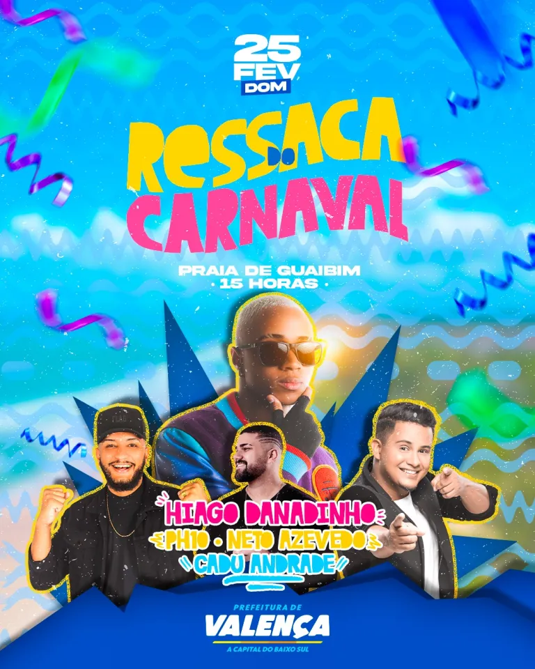 A Prefeitura Municipal de Valença está promovendo uma Ressaca de Carnaval na Praia de Guaibim, marcada para começar às 15h. As atrações confirmadas para agitar o público são Hiago Danadinho, PH10, Neto Azevedo e Cadu Andrade, garantindo um repertório diversificado para todos os presentes.