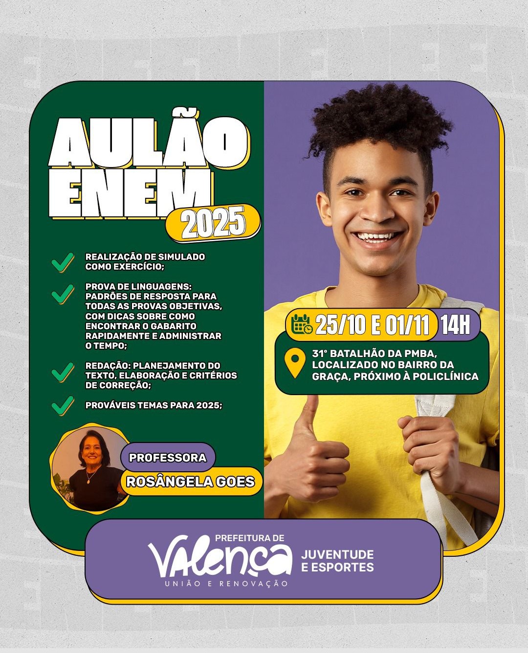 A Prefeitura de Valença, por meio da Secretaria de Juventude e Esportes, promoverá um aulão preparatório para o ENEM 2025, voltado aos estudantes que irão participar do exame nacional. O evento ocorrerá nos dias 25 de outubro e 1º de novembro, a partir das 14h, no 31º Batalhão da Polícia Militar da Bahia (PMBA), localizado no bairro da Graça, próximo à Policlínica.