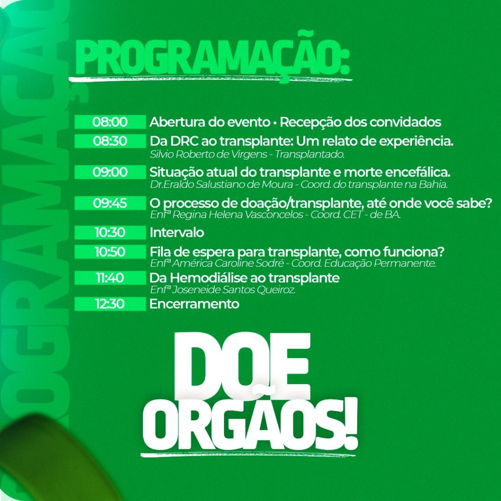 A Prefeitura de Valença, em colaboração com o Governo do Estado, o Sistema Único de Saúde e Transplantes Bahia, realizará um evento de incentivo a doação de órgãos no dia 30 de agosto, das 8h às 13h, na Primeira Igreja Batista, Praça da República.