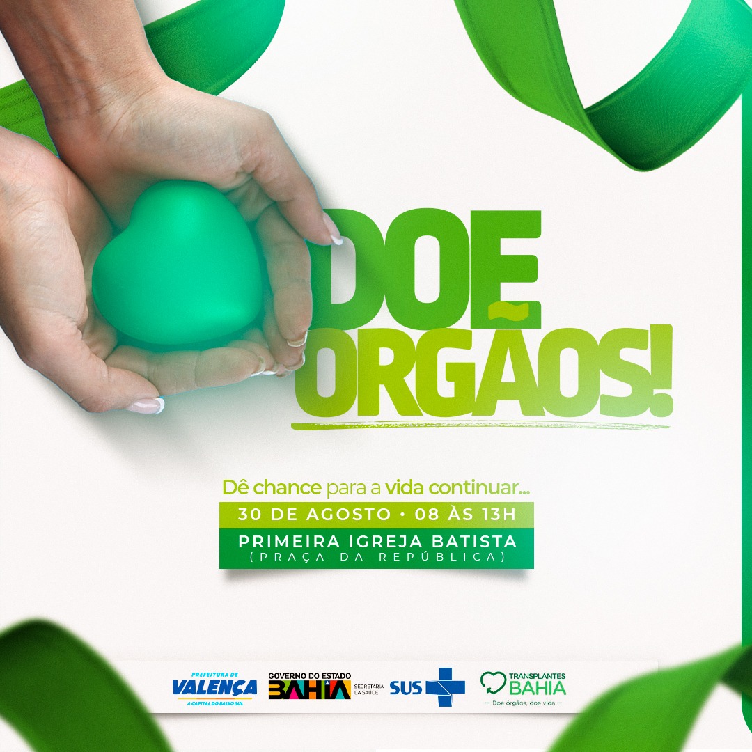 A Prefeitura de Valença, em colaboração com o Governo do Estado, o Sistema Único de Saúde e Transplantes Bahia, realizará um evento de incentivo a doação de órgãos no dia 30 de agosto, das 8h às 13h, na Primeira Igreja Batista, Praça da República.