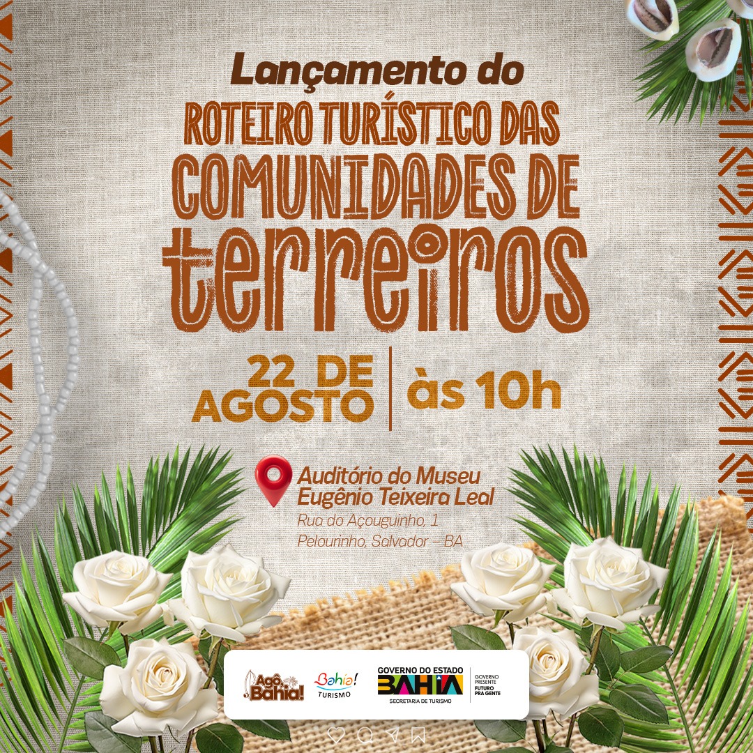 Será lançado, nesta quinta-feira (22), às 10h, no Museu Eugênio Teixeira Leal, no Pelourinho, em Salvador, o Roteiro Turístico das Comunidades de Terreiros. A iniciativa integra as ações do projeto Agô Bahia, desenvolvido pela Secretaria de Turismo do Estado (Setur-BA), para a valorização das religiões de matriz africana e incremento do afroturismo baiano
