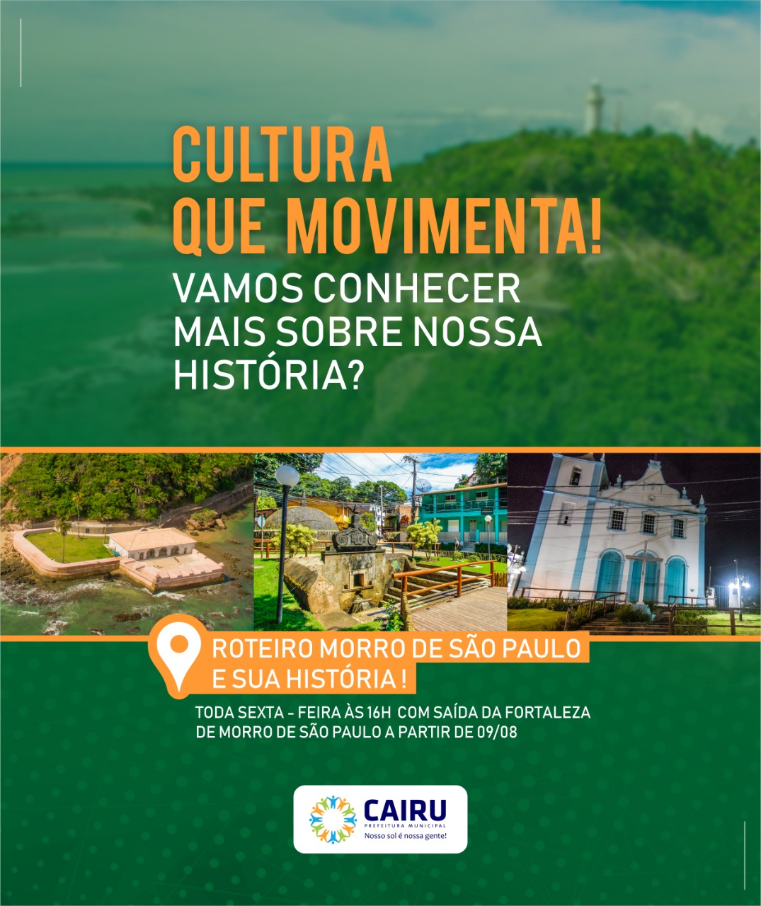 A Prefeitura de Cairu, por meio da Secretaria da Cultura, inicia no próximo dia 09/08 uma série de visitas guiadas gratuitas pelos patrimônios históricos de Morro de São Paulo. A iniciativa é aberta tanto para turistas e visitantes, como para estudantes e a comunidade de modo geral, que terão a oportunidade de participar de um passeio por pontos que fazem parte da história do Brasil Colônia. A ação acontecerá toda sextas-feira, às 16h, com saída da Fortaleza do Morro de São Paulo.