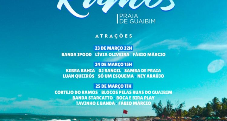 Na segunda-feira, a partir das 11h, não perca o Cortejo de Ramos, Blocos pelas ruas de Guaibim e as apresentações da Banda Staccato, Boca e Bira Play, Tavinho e Banda e o Mago Fábio Márcio.
